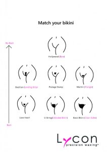 If you have been shaving, make sure not to shave for at least a week before your intimate wax and longer if possible. Hair should be ¼ – ½ inches long, but don’t worry if it’s longer as it can be trimmed by your therapist. Below is a good indication of the level of intimate waxing you require.